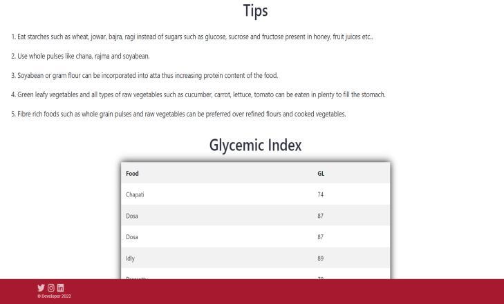 Inadditiontotheaboverecommendations,glycemicindex (whichisafigurebetween0 100thatdenotestheabilityof carbohydratesinfoodtoincreasethebloodsugarlevel)of some common foods is mentioned for users to make informeddecisions.Further,othergeneraltipsarepresented tocreatemoreawarenessasshowninFigure5.