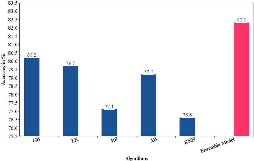 Thehardvotingclassifierwasimplemented.Hardvotingisan ensembling method that selects the class with the highest number of votes. The votes refer to each individual base modeloralgorithmintheensemble.Chart1comparesthe performance of the five algorithms considered against the finalensemblemodel.