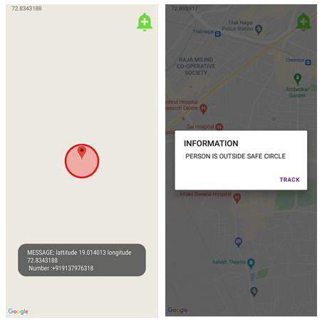 Later on, this SMS is received by the user’s/relative’s mobilephone.TheapplicationprocessesthereceivedSMS after the user has completed the login process which is done to have proper authentication and security. The coordinates of users/relatives are compared with coordinates received by the latest SMS. If the distance of both the coordinates is more than 200m then application notifies the user that person is not inside the safe circle and the live location of person dealing with dementia is displayedontheapplicationthroughout.