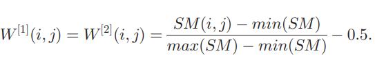 Based on similarity matrix SM, two identical initial weight matricesW[1] andW[2] canbeconstructed. Hence, W[1](i,j) is the weight between the ith node of the inputlayerandthejthnodeofthehiddenlayerandW[2](i,j)is theweightbetweentheithnodeofthehiddenlayerandthe jth node of the output layer. The bais to each node for its higher activity is set to a random value between [−ρ, ρ] initially.