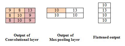 Pooling layer perform down sampling by reducing the numberofparametersintheinputs.Inthepoolinglayerthe filter does not have any weights. The kernel applies an aggregationfunctiontothevalueswithinthereceptivefield. Fig.3.illustratesthemaxpoolingwithfilter2*2andstride1.