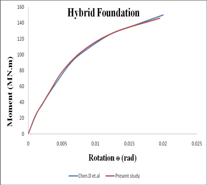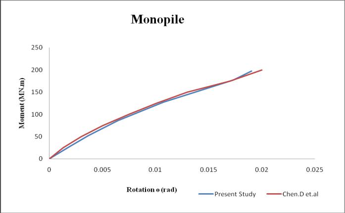 TheresultsobtainedfrompresentstudyandChen et.al (2020) on monopile foundation are plotted and compared. The moment rotation graphs of both present study and Chen et.al (2020) shown in Fig 2. The results show some variations (less than 10%) due to the assumptions of unknown data. The comparison between presentstudyandthatintheChenet.al(2020)showshigh levelofagreement.