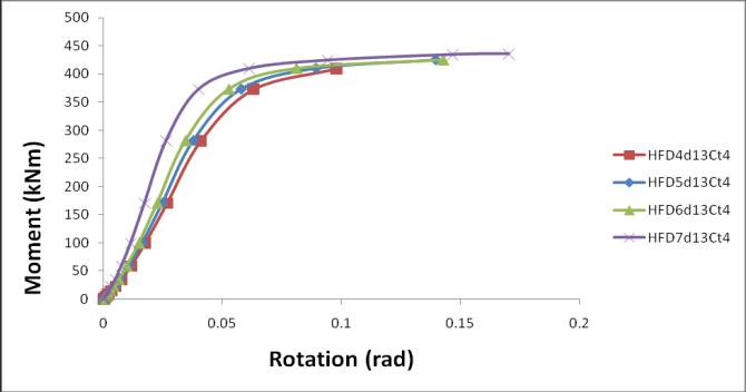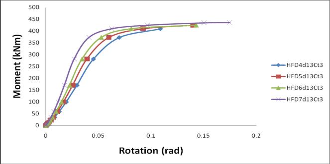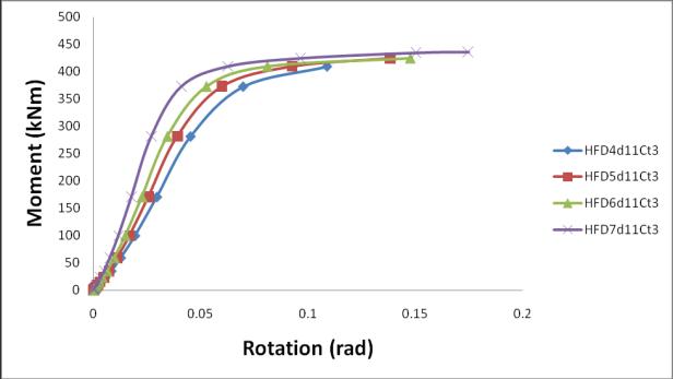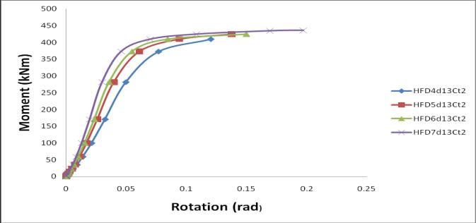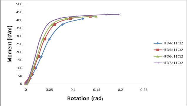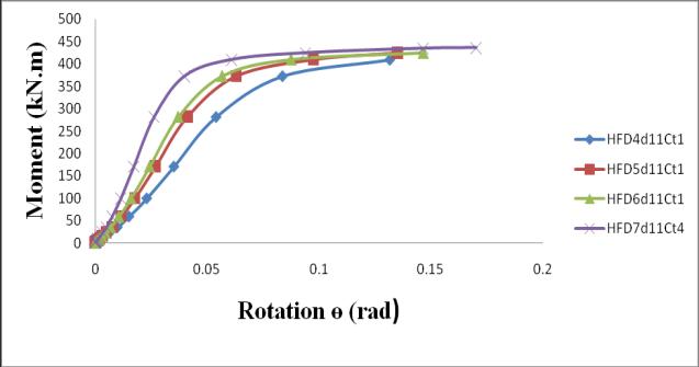 BycomparingbothFig9andFig10,themomentbearing capacity of CFHF will increases with the increasing wide bucket diameters. The thicknessofconcrete alsohave the positive influence on the moment bearing capacity. This combinationofCFHFwillreducetherotationoftheCFHF