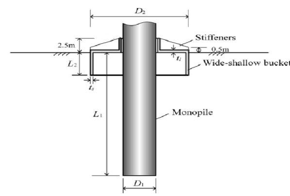 ThedetailedschematicrepresentationofCFHFisshown in Fig.3.6 .Here D1 is the outer diameter of double skin monopile and L1 is corresponding embedment length. Wheretp,tl,tsarerepresentingthethicknessofmonopile,lid andskirtsrespectively.D2isthediameterofwidebucket, L2 is the embedment length of wide bucket and Ct is the concrete thickness. A 3 MW turbine is used for present study.