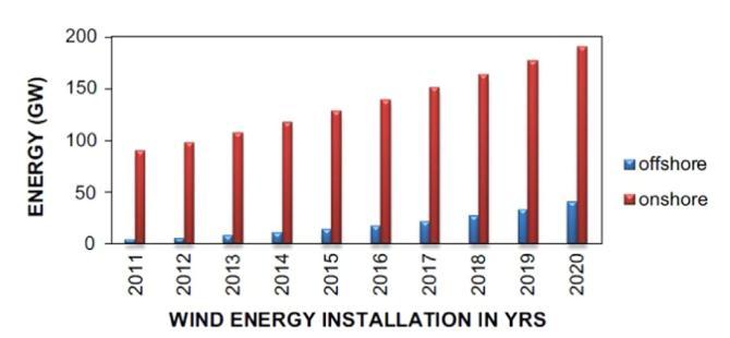CurrentlyEuropeisthegloballeader inoffshorewind energy sector. The first offshore wind farm (i.e. Vindeby) wasinstalledinDenmarkin1991.AccordingtotheGlobal Wind Energy Council’s (GWEC) report the global OWP marketcapacitygrownfrom29.2gigawatt(in2019)to35 gigawatt (GW) and the current OWP capacity is 35.3 GW where United Kingdom has 29% of the global installation capacity.“HornseaProjectOne”isoneofthelargestoffshore windprojectsinUnitedKingdomwhichhasthecapacityof 1.2 GW. According to the statistics the global OWP installationcapacitywill exceedtwothousandgigawatt in 2050.CurrentlyourIndiahasnooperationalOWPplantbut thefirstonegigawatOWPprojectwasplannedinGujarat. Fig1showsthedevelopmentof thedevelopmentofwind turbine.