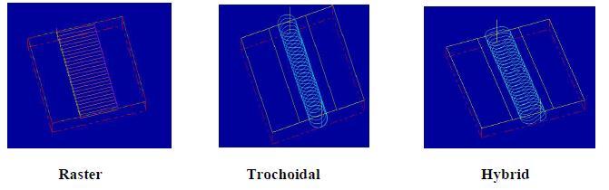 3Trochoidaltoolpathwasfoundtobeidealtoolpathbecause the engaging time of the tool is less when compared to Raster and Hybrid. Raster and Hybrid tool path contains linearmotionwhichincreasestheengagingtimeofthetool.