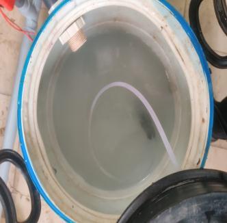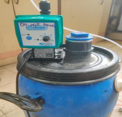 TankCapacityof300litersistakenasthesourceofwaterwith15minutesastimeofflow,soweget0.33 l/s offlowinthe40 mm pipe. Considering chlorine dosage as 5 mg/l, total chlorine required is 1.5 g and bleaching powder required is 4.5 g (containing33%chlorine).Taking25litersofinthechlorinatortankandmixing75gofbleachingpowdertogettherequired concentration of chlorine. Rate of Dosing pump was set on 6 LPH so that it injects 1.5 liter of water with 4.5 g of bleaching powderin15minutes.