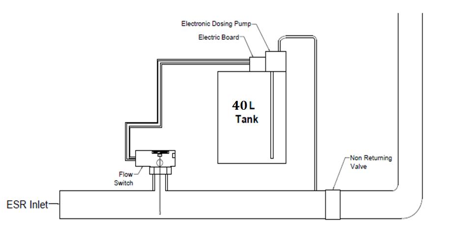 Whenthe waterstartsflowingintheinletpipeof theESR,the flowswitchdetects itandactasa switchtoclosethe circuit of the power supply of the dosing pump. As the circuit closes the dosing pump starts. The dosing pump suck the chlorinefromthe50LtankandstartsinjectingthechlorineintheinletpipecarryingwaterintheESR.Wecansettherequired doseofchlorineonthedosingpump.TopreventdamagetodosingpumpfromthebackflowfromtheESRanon returnvalve isinstalledjustafterthejointofdosingpumpoutletpipeandtheinletpipeofESR.