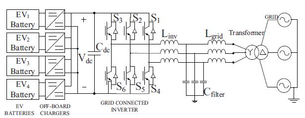 DCfastchargingstationconfigurationincludesEVbatteries,on boardcharger,grid connectedinverter,dcbus,LCLfilterand step up transformer.It implements V2G G2V framework in microgrid. There are twoimportant components of this charging stationare