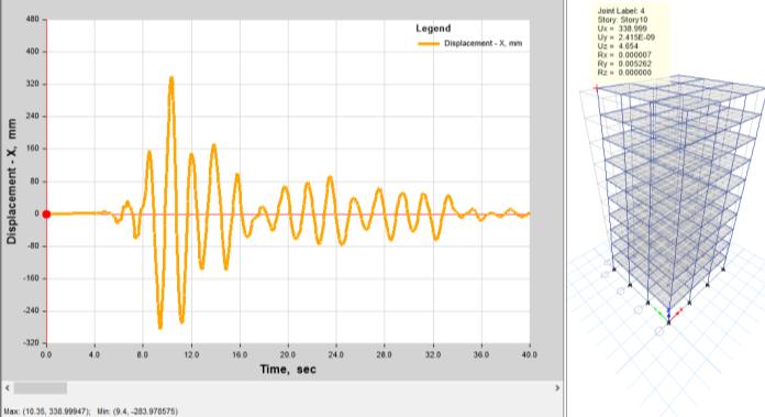 fig 5.8 shows the dynamic displacement curves of the 10 story structure in the X and Y directions at the top of the structure with the Imperial Valley ground motion using ETABS. The peak displacements of the 10 story structure in the X and Y directions are 338.99mm and 172.73mm respectively.