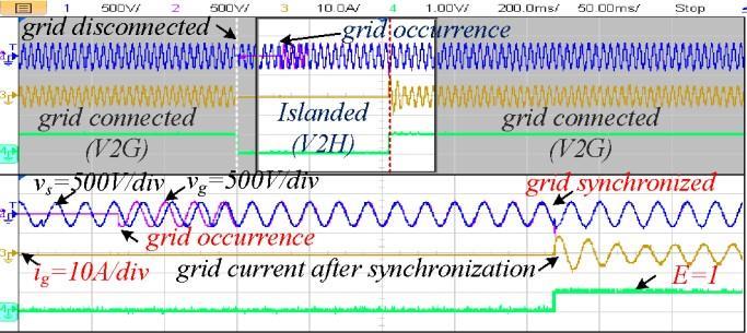AnintegratedchargerwithsolarPVarray,householdload and grid has been implemented using the IGBT switches based converters, solar simulator, EV battery, dSPACE (1006) controller and the test results have verified the simultaneous EV charging and household supply in both islandedandgridconnectedmodes.Fromthesetestresults, it is observed that this charger is performing its specified task ofEV charging,supplyinglocal loadsand maintaining the power quality at the grid side. Moreover, the islanded operation with voltage THD less than 5% and vehicle to home operation using solar PV array is also verified. The demand based reactive power support and the active power filtering using VSC are also validated through test results. The smooth transition from islanded to grid connectedmodeandviceversaareverifiedbytestresults.