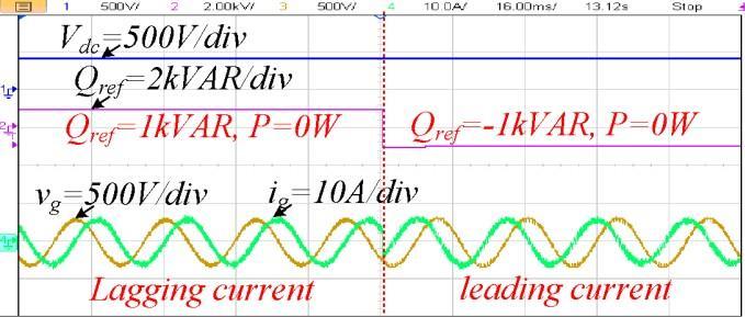 Fig. 9 shows the V2G reactive power performance at Pg=0kW. Due to the step change in the reference reactive power(Qref) from 1kVAR to 1kVAR, the grid current (ig) becomesleadingfromlagging.Moreover,thedc linkvoltage
