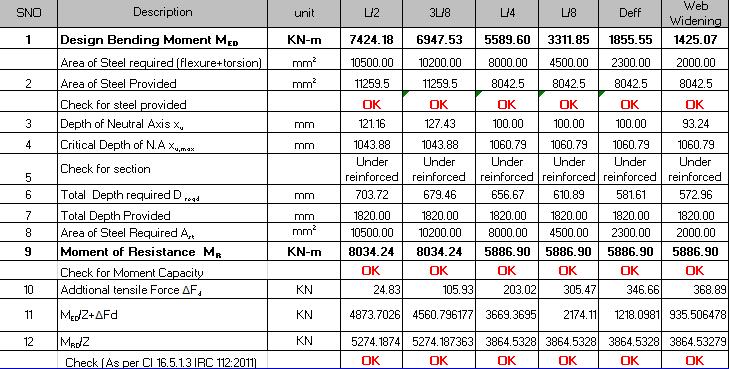 Deff Web Widening 1 KN-m 6600.01 6179.25 4985.97 2843.90 1565.07 1310.33 mm 2 10500.00 10200.00 8000.00 4500.00 2300.00 2000.00 2 mm 2 11259.5 11259.5 8042.5 8042.5 8042.5 8042.5 Checkforsteelprovided OK OK OK OK OK OK 3 mm 121.16 127.43 100.00 100.00 100.00 93.24 4 mm 1043.88 1043.88 1060.79 1060.79 1060.79 1060.79 5 Under reinforced Under reinforced Under reinforced Under reinforce Under reinforced Under reinforced 6 mm 670.36 663.77 644.54 601.48 575.78 570.65 7 mm 1820.00 1820.00 1820.00 1820.00 1820.00 1820.00 8 mm 2 10500.00 10200.00 8000.00 4500.00 2300.00 2000.00 9 KN-m 8034.24 8034.24 5886.90 5886.90 5886.90 5886.90 OK OK OK OK OK OK 10 KN 24.83 105.93 203.02 305.47 346.66 368.89 11 KN 4332.668 4056.4544 3273.107 1866.92 1027.414 860.1858 12 KN 5274.187 5274.1874 3864.533 3864.53 3864.533 3864.533 OK OK OK OK OK OK Check(Asper16.5.1.3IRC112.2011)