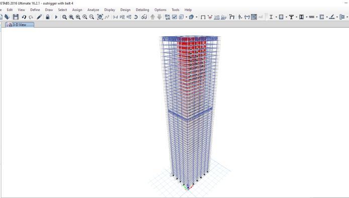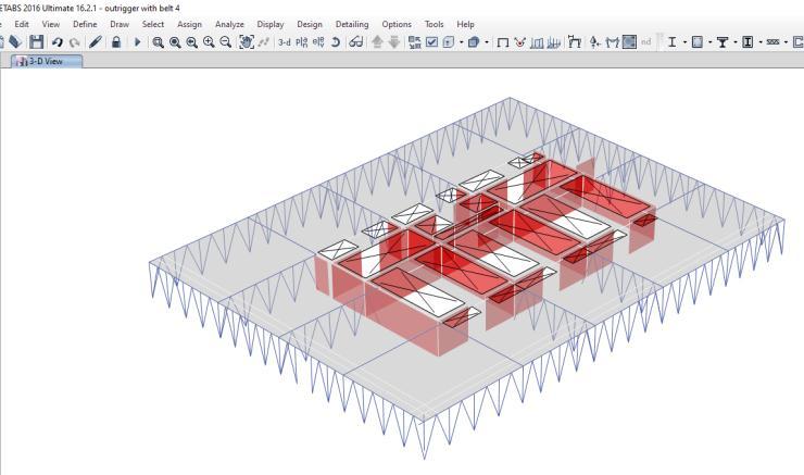 As discussed in section 2, a generic commercial building having 54 storey and floor area of 49.7x49.7m has been assumed.TheETABSmodelforthebuildingalongwiththe outriggercombinationsisshowninfigures3to5