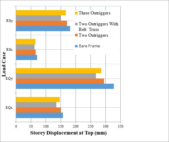 being symmetrical building this difference in the directional displacement because the outriggers in X direction are aligned on either side of the Shear wall core whereas; it is slightly staggered in Y direction. Additionally,itisseenthatthemaximumtopdisplacement reduction of 18% compared to the bare frame occurs in thecaseoftwooutriggerswithperipheralbelttruss.