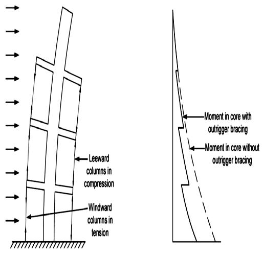 Fig 2 Structuralbehaviourofanoutriggersystemand comparisonofmomentdiagramswithandwithout outriggerbracings[6]