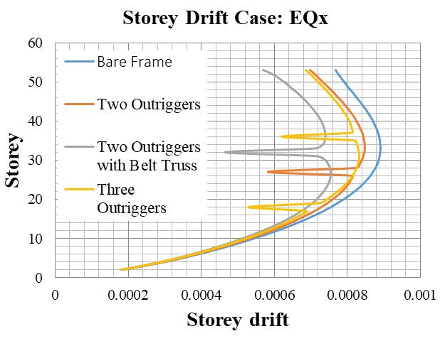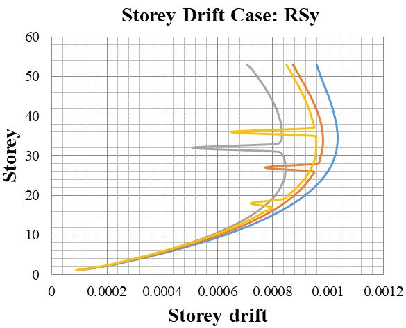 Storey drift is the difference between the lateral displacement of a floor to the floor below and the storey drift ratio is the storey drift divided by the storey height. Chart 2 show the storey drift ratios for various structural combination using the equivalent static method along the x and y directions. Similarly, Chart 3 shows storey drift ratiosusingtheresponsespectrummethod.