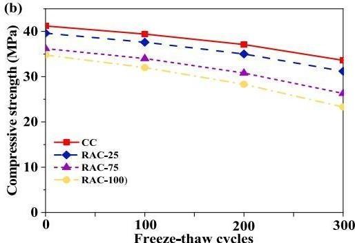 AccordingtotheASTMC666-97protocol,rapidfreezing and thawing in water was used for the freeze-and-thaw experiments [15]. For a maximum of 300 cycles, the relative dynamic modulus of the test prisms was measuredinordertotrack thefreeze-and-thawdamage. By taking an accurate transverse frequency reading of the specimens, one can calculate the relative dynamic modulus. The durability factor served as a representation of how well concrete performed in freeze-and-thaw conditions. A strong resistance to freeze- and-thaw action can be observed in RCAconcrete mixes proportioned by the traditional mix designmethod(100percent RCA content) or by the EMV method (63.5 percent and 74.3 percent RCA content for RCA-concrete made with RCA- MO and RCA-VA, respectively). in Fig. 4, the results revealed that, with the exception of RAC- 25, all RAC had a high level of permeability after 300 F-T cycles. The ancient mortar's excessive porosity and microcrackson the RCAsurface are the cause of the high chloride ion permeability. More chloride ions can enter the RAC specimens because there are more holes and microcracksthat have created and connected flow channels. In addition tosulphoaluminate cement, fly ash andsilicafumearemineral admixturesthatcanincrease the durability of concrete. The quality of RCA and the type of concrete used are the main