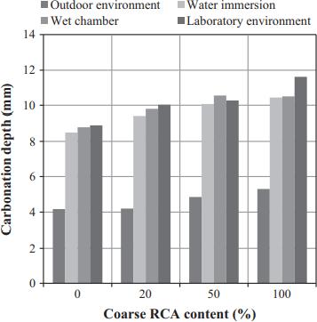 The use of mineral additions as cement replacement causes greater carbonation depths than those of mixes withoutthem.ThishappensbecausetheCa(OH)2content decreases thus lowering the pH of concrete. Nevertheless, irrespective of the presence of RCA, the difference in carbonation depth is similarover time to that of the corresponding NAC, with or without any mineraladditions[17].