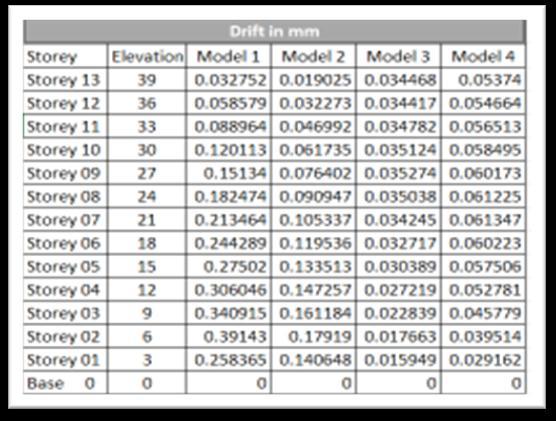 From the models studied, it shows remarkable changeinthestoreydisplacementandstoreydrift, duetoaddingofdifferentstructuralelements,there isreductioninthestoreydisplacementandstorey drift