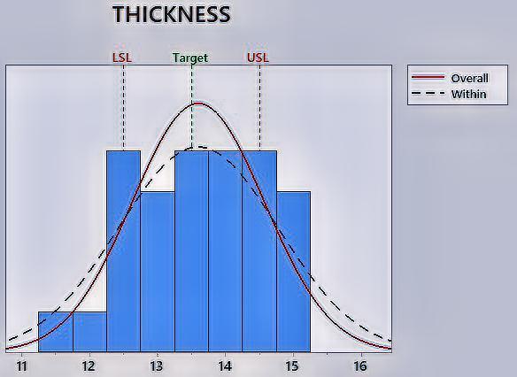 Theimplementationisnotsoeasy.Personnelareresistantto change.Theyarecontentwiththewaythingsare.Itrequires moresupport from the management. Theimplementation mayrequirecapitalinvestment.Themeasurementprocessis repeatedafterimplementation.Thenewprocesscapability indexandprocesscapabilityratioaredetermined Forwidth, processcapabilityindex(Cpk)is0.69andprocesscapability ratio(Cp)is0.7.Forthickness,CpkandCpare0.75and0.65 respectively.Analysisafterimplementationisshownbelow.