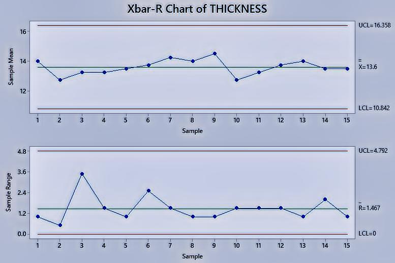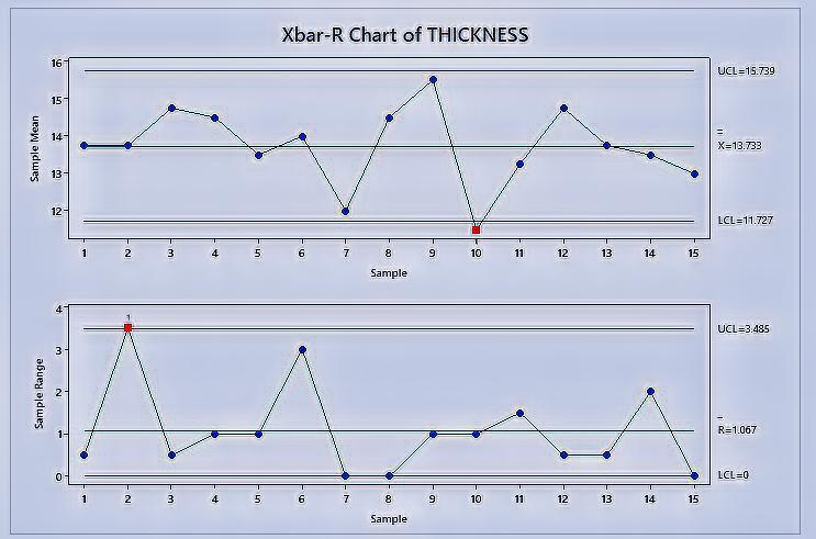 Fromthex barandR chart,itisclearthatthevariationsof thicknessareundercontrol.Buttheprocessisnotcapableto conform the product to the required specification limit. A processisconsideredtobecompetentifalmost100percent of its output meets the standards. Here process is in command while still failing to meet specification requirements.Thisresultissameasforwidth.