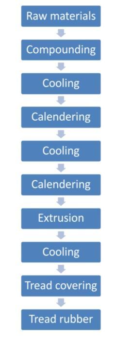 Thetreadrubbercompoundistheintermediateformofthe actualtyre.Itistheportionthatprovidestheadequategrip andfrictionontheroad.Asithasmorecontactontheroads, thereisahighchanceforwearandtear.Sothequalityofthe treadisverysignificantindeterminingtheperformanceof eachtyre.Thetreadrubberismanufacturedbya seriesof processessuchasmixing,calendaring,extrusionetc.Theraw materials used for the tread rubber are natural rubber, syntheticrubber,carbon,chemicalsetc.Therawmaterials aremixedinanintermixerandthenitundergoaseriesof calendaring.Finallyitisextrudedthroughaparticulardie.