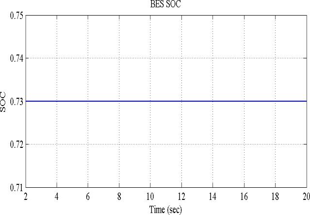 Figure5(a)showsrealpowerexchangeofthethreeSolar PV units and the BESS with the utility grid. The three Solar PV units operate under similar conditions and thus, theiroutputpowercurvesareoverlapped.Thesimulation starts, when each Solar PV unit supplies 0.4 pu to the microgrid, the utility grid supplies 0.51 pu to the microgrid and the battery initial SOC is 0.73, which is within the pre specified range (70% 75%). Thus, the BESS output power is zero during this case and the SOC remainsconstantasshowninFig.5(b).
