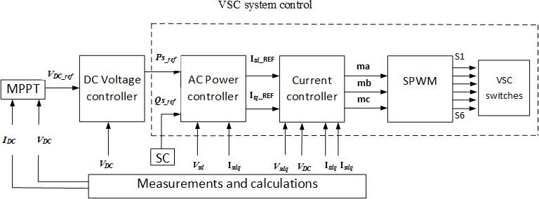 Figure 3 shows the LC of each Solar PV unit which includesaMaximumPowerPointTracking(MPPT)control, a DC Voltage controller and the VSC system control. The MPPTprovidesthe referenceDCvoltagetotheDCvoltage controller. The DC voltage controller generates the reference real power (Ps_ref) for the VSC system control. The current controller of the VSC system controls the VSC output power to track the AC power reference generated fromtheDCvoltagecontrollerbyprovidingthemodulation indexesfortheSPWMschemeoftheVSC.Inthisthesis,itis assumedthat thereisnoreactivepowersupportprovided bytheSolar PVunits,i.e.,theSCsetsthereferencereactive power(Qs_ref)oftheSolar PVunitstobezero.