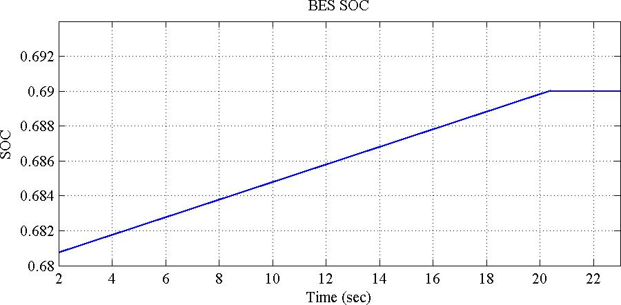 Figure6(a)showstheactivepowerexchangeofthethree Solar PV units and the BESS with the utility grid. In this case, the simulation starts when each Solar PV unit supplies 0.4 pu to themicrogrid system, the grid supplies 1.35pu,andtheBESS initialSOCis0.6817whichislower than the specified SOCmin L(0.69). Consequently, the batterystartschargingattheratedpowerasshowninFig. 4.12(a)untilSOCmeetsthelowerlimitat t =20.4secand becomesconstantagainasshowninFigure6(b)