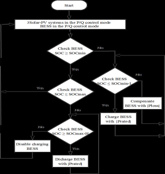 In the grid connected mode of operation, the microgrid’s voltage and frequency are determined by the utility grid. The grid supplies any power deficit and absorbs any surplus power of the microgrid system. The proposed control strategy regulates the solar PV units to exchange real and reactive power with the microgrid through the current controller of their VSC systems while tracking their MPPs.Thecontrol strategyalsocontrolstheBESS to satisfy its SOC constraints while regulating the active and reactive power through the current controller of its VSC system. The control strategy in the grid connected mode hastwomainfunctions.i)extractingthemaximumoutput powerfromthethreeSolar PVunitsbasedontheirMPPT controls. ii) controlling the battery SOC at a certain level whichcansupportthemicrogridvoltageandfrequencyin the islanded mode. The proposed control strategy attempts to keep the BESS in the grid connected mode in an idle state, i.e., neither charging nor discharging, which reduces the number of charging/discharging cycles and extendsbatterylife[33].