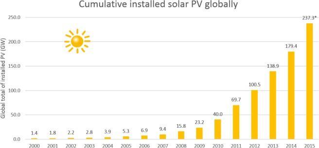 Figure1.1:TotalinstalledSolar PVaroundtheworld forthepast15years[2].