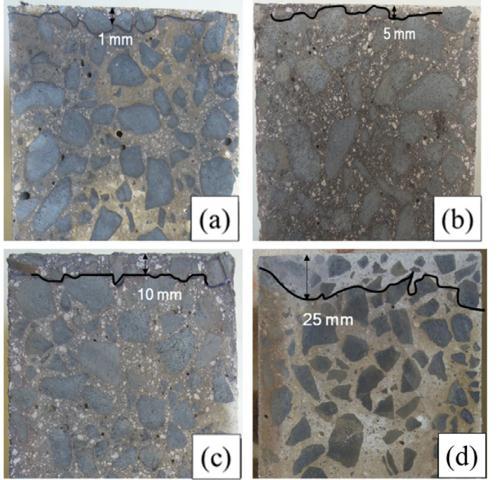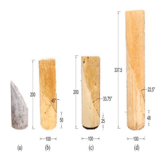 Fig. 11. CementConcretespecimens(a)beforerepairwith aninclinationangleof45°,andafterrepairwithinclination anglesof:(b)45°,(c)33.75°,and(d)22.5°beforeandafter repair[64]