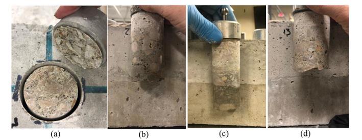 Figure 14 .Failureofthepull offspecimensin:(a)top surfaceoftherepairmaterial,(b)bondsurfacearea,(c) repairmaterial,and(d)substratematerial[64]