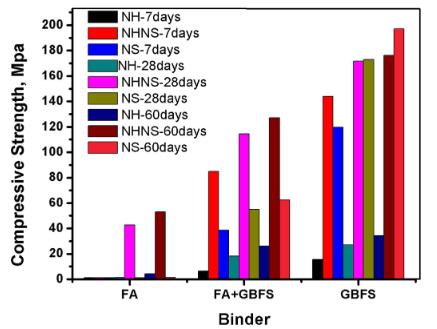 At later ages, the use of NHNS showed a considerable improvement in strength development. The 7 day compressivestrengthofFApastewithNHNSwasverylow, but the compressive strengths of 28 day and 60 day old specimensweresubstantiallyhigher,with45.0and52.9MPa, respectively.Theslowerreactionrateatambienttemperature wasattributedforthelesserstrengthofFApasteearlyon.FA paste,ontheotherhand,developedstrengthinasimilarway toOPCconcreteovertime[47].ThepastewithNHandthe pastewithincreasedGGBFScomponent(FA+GGBFSpaste) produced lower strength than the pastes with NHNS and NS.The leaching of silica and alumina required NaOH, as