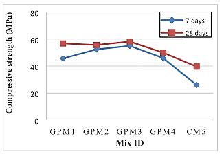Foraratioof0.96,compressive strengthofupto47.1MPawas achieved. When the SiO2 to Na2Omolarratiowasraised,the compressive strength was also reduced. the participation of excessive Si ions in the geopolymerization process cause this reduction in the compressivestrength.Ataratio of1.91,thelowestcompressive strength(40.8MPa)wasfound.