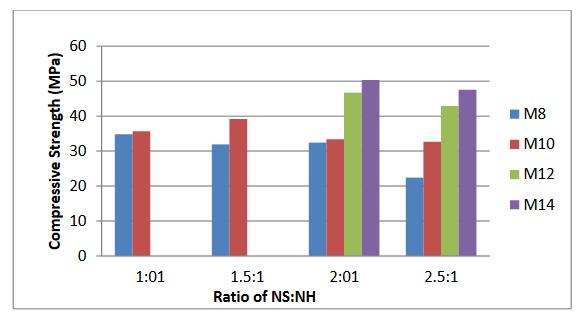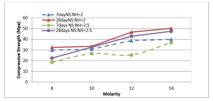 Tanakonetal.[28]investigatedtheeffectsofdifferentNaOH molarities (6M, 10M, and 14 M) on the development of compressive strength in geopolymer mortar. The study showed that as molarity increased, compressive strength increased as well. On the other hand, the effect of concentrationofNHsolutionintermsofmolarity(8M,10M, 12M,14M)theresultsshowthatthecompressivestrengthof the geopolymer mortar mixes increased with increase of concentration in terms of molarities of NaoH. The highest compressivestrengthachievedat14Mas50.3MPaat28day aspresentedin(Fig.5)[43].