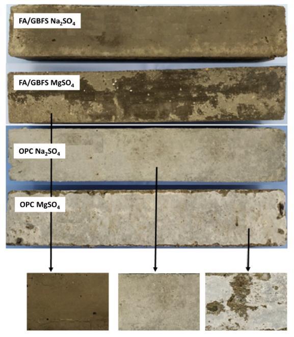 calciumalkali activatedsystems,ontheotherhand,allowfor ionexchangebetweenthesulphatesolutionandthenetwork structure, potentially making it more resistant to sulphate attack[88,90,91].Douglasetal.[92]foundthatafter90and 120 days of exposure to a 5 percent Na2SO4 solution, the visualappearance,mass,strength,expansion,anddynamic modulus of elasticity of slag based geopolymer concrete change little, outperforming OPC concrete. However, after 270days,theflyash/slaggeopolymerconcretehadalarger depositionofsaltsandcracks,andthephysicaldeterioration oftheOPCconcretewasmuchgreaterforthesameexposure periodsasshownin (Fig.16)[89].El Sayedetal.[71]found thataslag basedgeopolymeractivatedwith6wt%NaOHlost 49%ofitsstrengthafter6monthsofexposureto5%MgSO4, comparedto21%activatedNaOHandNa2SiO3(3:3),which could be due to excess hydroxide ions forming excess ettringite.Furthermore,thestrengthofconcreteactivatedby twodifferenttypesofactivatorsisremarkablysimilartothe strengthofconcretecuredatroomtemperature.