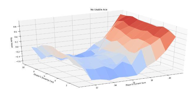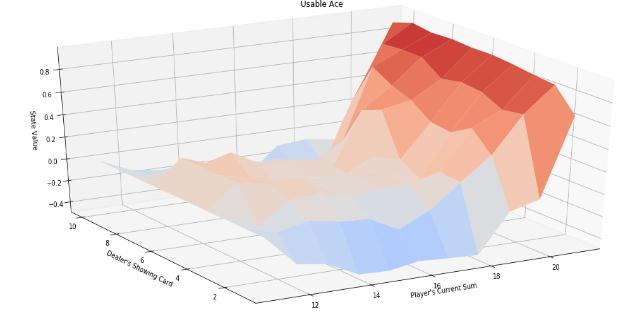 Toaddressthisissue,Q learning,areinforcementlearning technique, will be used. For each state action pair, a Q table is created, and the related entry in the Q table is changed based on the prize won after each round of the game. After the agent has thoroughly studied the environment, the learning process is complete. At this point, we'd have the optimised Q table, which is the blackjackstrategytheagenthaslearned.Itisareasonable choice as a performance measure because a prize is awarded at the end of each round of the game. To assess the efficacy of various approaches, a large number of rounds must be played in order to get close to their true rewards. As a result, the average reward after 1000 roundsofthegamewillbeusedtocomparethesimulated performance of the typical casino player to that of the trainedagent.