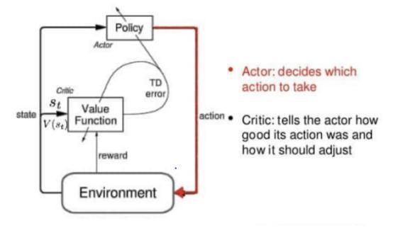 The actor uses the state as input and produces the best action. It effectively regulates the agent's behaviour by teachingitthebestcourseofaction(policy based).Onthe otherside,thecriticcomputesthevaluefunctiontoassess theaction(valuebased).