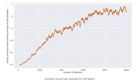 The reward (average of 100 episodes) is plotted along with the number of episodes and as we can see that the performance ofour bothas increasedsignificantly as the trainingprogressed.