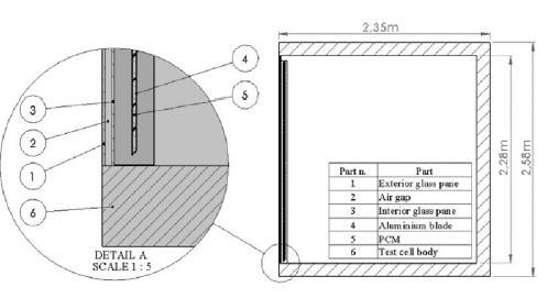 The aluminum alloy enclosure and paraffin wax make up the PCM louvre. The louvre pieces are 100 mm wide and are uniformly distributed within the glass structureatanangleof0°duringthedayand90°atnight. EnergyPlus, which uses the finite difference approach, doestheanalysisforevaluatingtheimpactofPCMlouvres used in the sunspace. A strong tool for assesing building energy which hasbeenusedextensively by researchersis EnergyPlus. The model is verified using experimental work on PCM shutters, taking into account the interior temperature and heat flux measurements collected in the room with PCM shutters on August 4 to check the correctness of the EnergyPlus model simulation. Figure 5 below depicts the test cell composition in PCM shutter study.