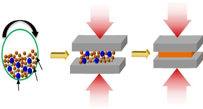 Using a hot pressing process, multipurpose films that itself contain nano TiO2 and thermochromic powders werecreated.IndividualpowderswereputintoPVCfilm at a rate of 5% and 10%. PVC film was doped with mixtures of 0.5 percent blue 3 percent TiO2, 1 percent blue 3 percent TiO2, 2 percent blue 3 percent TiO2, and 4 percent blue 6 percent TiO2 powders. Figure 7illustrated below,depicts a typical multifunctional film manufacturing process through hot pressing. PVC powder was first thoroughly mixed with nano TiO2 and black, blue, and red variants of thermochromic powders for approximately 5 minutes, as being illustrated below. Asthenextstep,theuniformlydispersedmix of powder was kept between two parallel plates after being put betweentwosubstrates.Before loading thesamples,the plateswerewarmedto200oC.