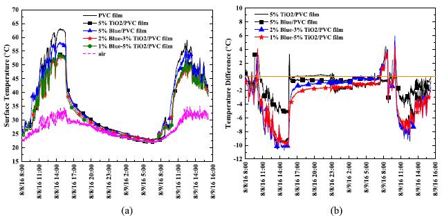 Fig.10.Surfacetemperature(a)differenceof temperature(b)forplasticscoveredwithvarious films.[16]