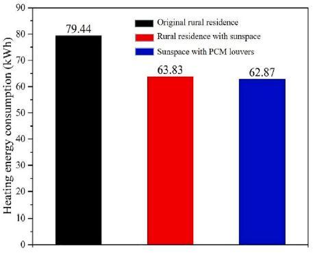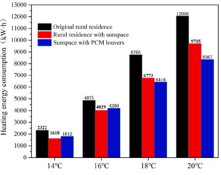Multiple comparison evaluations were carried out for theenergyconsumptionforheatingofatraditionalrural dwelling in peak level cold region of China, taking into account the installation of a sunspace and extra PCM louvres.Thecomputationsareconductedin thiscontext for three distinct construction types: the original rural dwelling, the rural residence having sunspace, and the