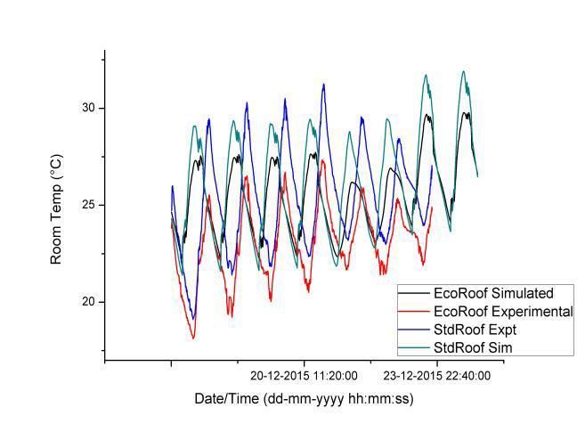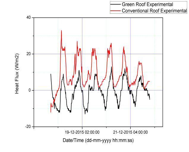 capture heat flow data at 15 minute intervals. Figure 15(a)shown below depicts the heat transfer history over the course of six days. Green roofs had lower heat flux peaks than conventional roofs, as could beseen in the figure. The simulations of green and conventional rooms demonstrate a high level of consistency with the experimental data as being illustrated in fig 15(b). In the experimental data, the temperature reduction in using green roof is depicted as an average of 4oC, but the simulation reveals a significantly smaller difference of 3.1oC degrees. It must also be mentioned that the temperatures associated with green roof represent a significant temporal difference from the traditional roof temperaturetrends.
