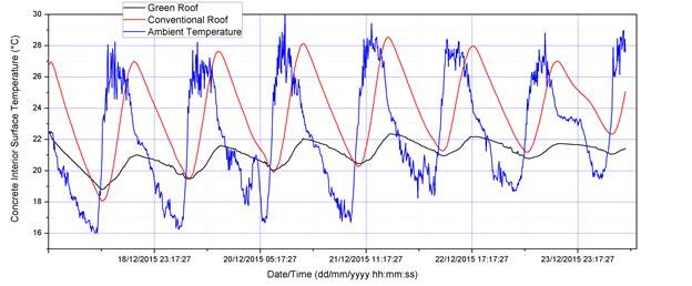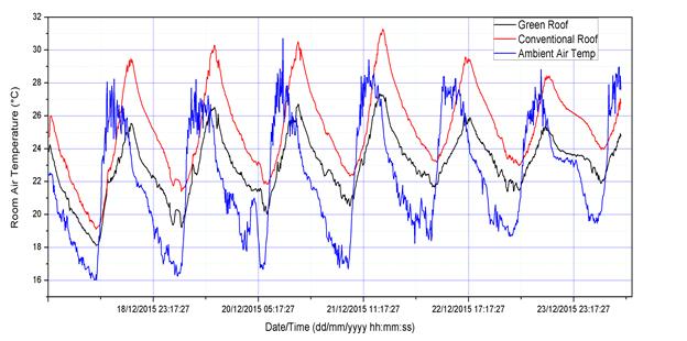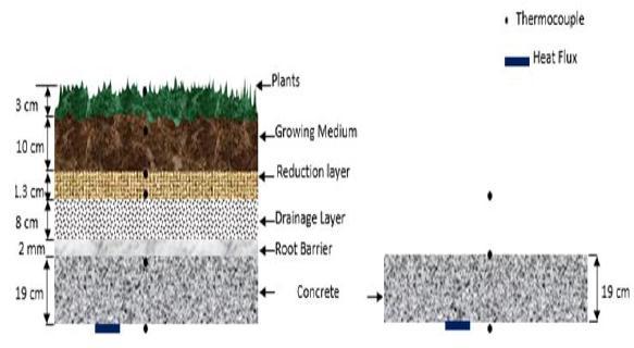 Two distinct types of roofs were put up to compute the effect of using green roofs on cooling potency: exposed roof (concrete slab) and onewith green roof layer. The measurements were taken between December 17th and December 24th, 2015. Figures 12(a) and 12(b) given below, illustrate the measurement points taken on the green roof layer and the conventional roof, respectively. The thermocouple was positioned in such a way that it could beused to monitor boththe temperature of the canopy of plant on the green roof and the retention medium effectively. Thetemperature of the surfaceand heatflowmeasurementswereobtainedinbothindoorand outdoor situations. All temperature data was taken every 10minutes,whileheatfluxwastakenevery15minutes.