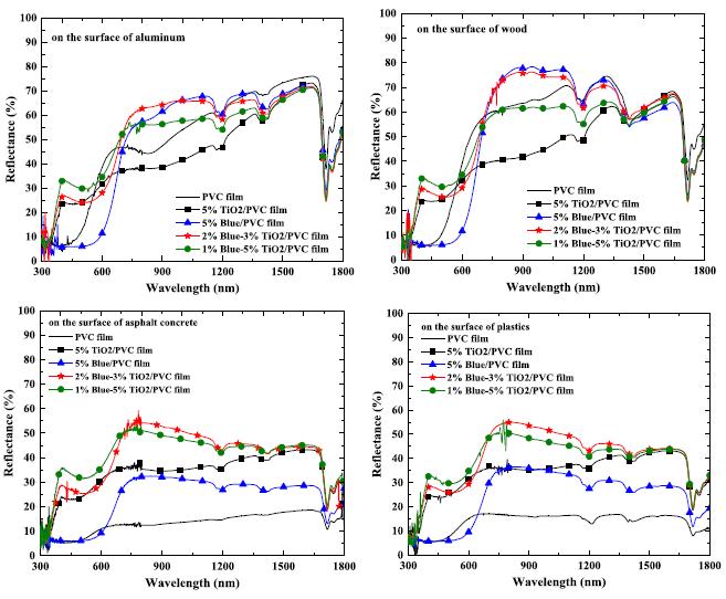 When doping 5 percent and 10 percent individual powders, the multipurpose film had SR of 7 18 percent and 11 20 percent, respectively, compared to 7 percent for the control film. Compared to other powders, the addition of blue thermochromic powder and TiO2microparticles, increases the solar reflectance of thefilm by148to211percent.Furthermore,combining both blue thermochromic powder and nano TiO2 particlessignificantlyenhancestheSRvaluesofPVCfilm from7%to24 35%.TheSRvaluesofthefilmswiththe addition of functional particles are raised up to 33 50 percent in the infrared spectrum. 5 percent TiO2/PVC film, 5 percent blue/PVC film, 1 percent blue 5 percent TiO2/PVC film, and 2 percent blue 3 percent TiO2/PVC filmwereusedtocreatenovelroofingsystemsbasedon cost and efficacy. As shown in Fig. 9 below, the reflectance spectra of the system of roofing planned werecomputedovermultiplerangeofwavelengthsfrom 300to1800nmusingspectrophotometryandwerethen compared to each other. The new roofing solutions are morereflectiveintheinfraredrangethantheyareinthe UV and visible ranges, as can be observedfrom the figure. Furthermore, multifunctional coatings on aluminium and wood have a greater reflectivity than asphaltconcreteandpolymers.