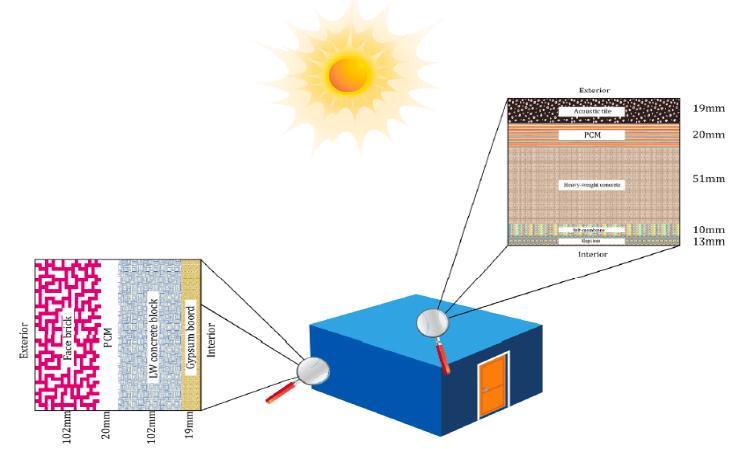 Al Rashed et.al [1] in his study, so asto lower the rate ofheat transfer, incorporated PCM in the sidewalls and rooftop of a buildingin Kuwait City, which has a very hot and humid climate. To examine the relationship among heat gain and melting temperature, PCM variants RT 31, RT 35 and RT 42 (with 20 mm thickness) are investigated. By inducing sol air temperature, the influence of solar radiation on vertical walls and roofs are investigated. Additionally, the annual rate of energy saving and avoidance of CO2 emission are investigated. In this study, the change in heat gain rate of rooms by installing PCM inside the walls and roof are examined.Thewallsofthebuildingareaugmentedwitha PCMlayerof20mmthicknessasshowninFig1.Thebase wallismadeoutoffacebrick(102mmthickness),gypsum board (19mm thickness), lightweight concrete block (102mmthickness)andtheroofismadewithacoustictile (19mm thickness), felt membrane (10mm thickness), heavy weight concrete (51mm thickness) and slag stone (13mmthickness).