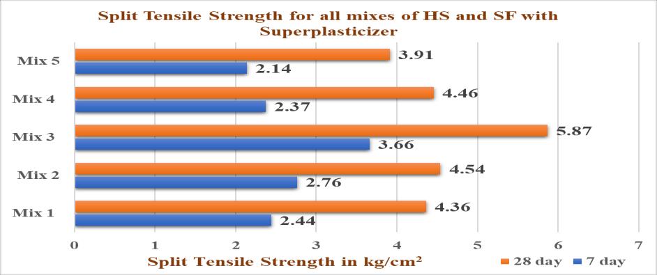 Figure3:Combinesplittensilestrengthinkg/cm2forall %ofHDandSFwithSuperplasticizerat7daysand28 days